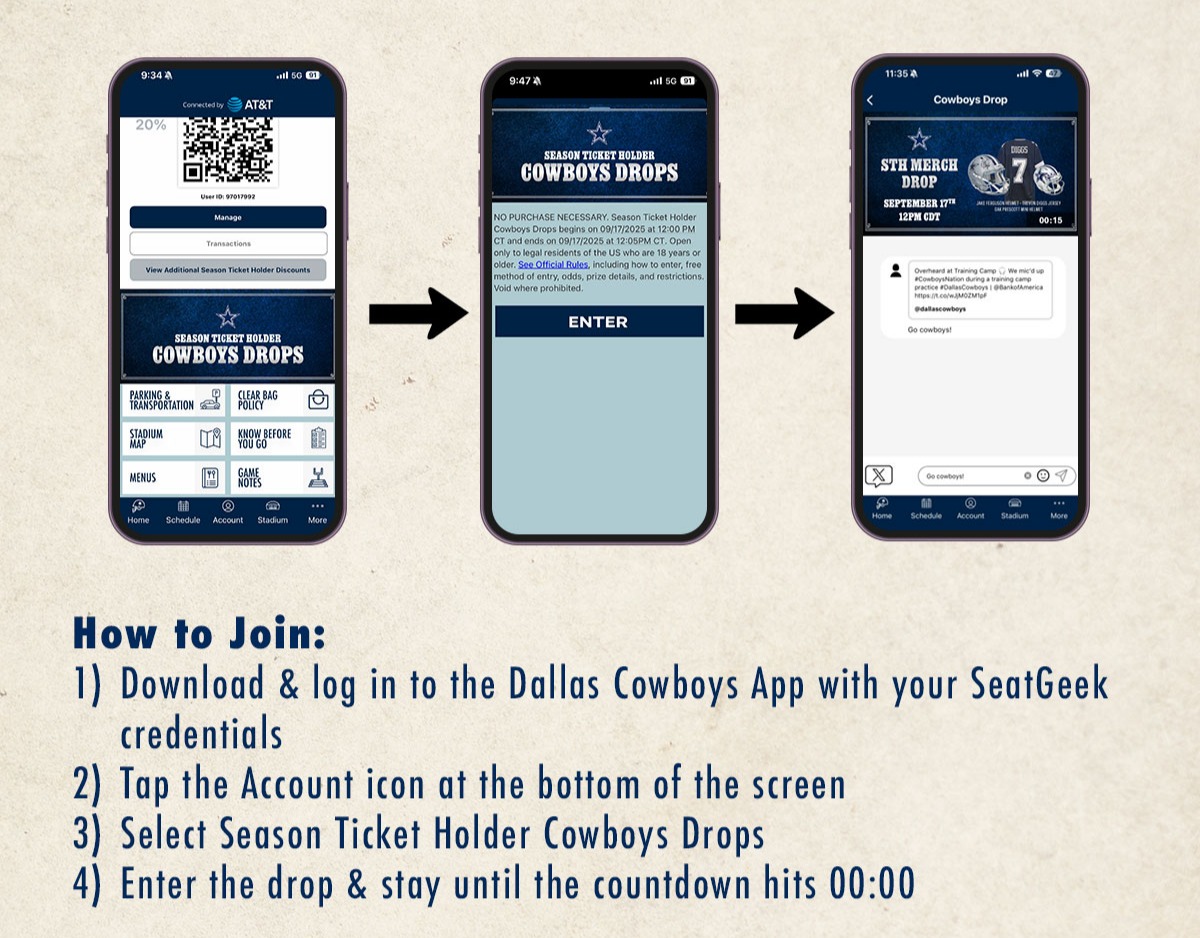 It’s time to level up your experience with exclusive, monthly Season Ticket Holder Cowboys Drops featuring autographed items from your favorite players, available only in the Dallas Cowboys App connected by AT&T.